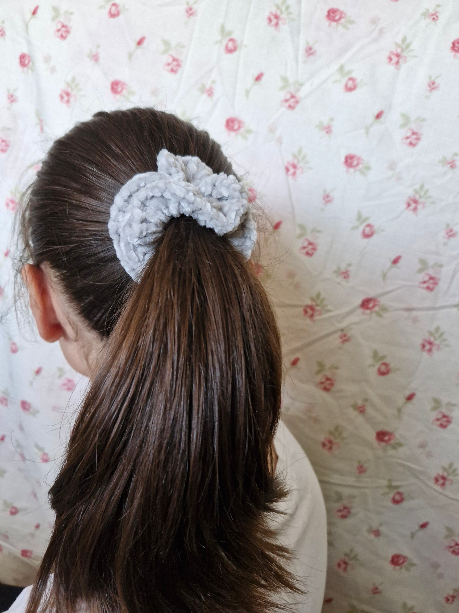 A misty grey scrunchie, that is a perfect addition for neutral tone lovers. Its soft grey appearance and velvet glowy sheen will enhance any outfit.