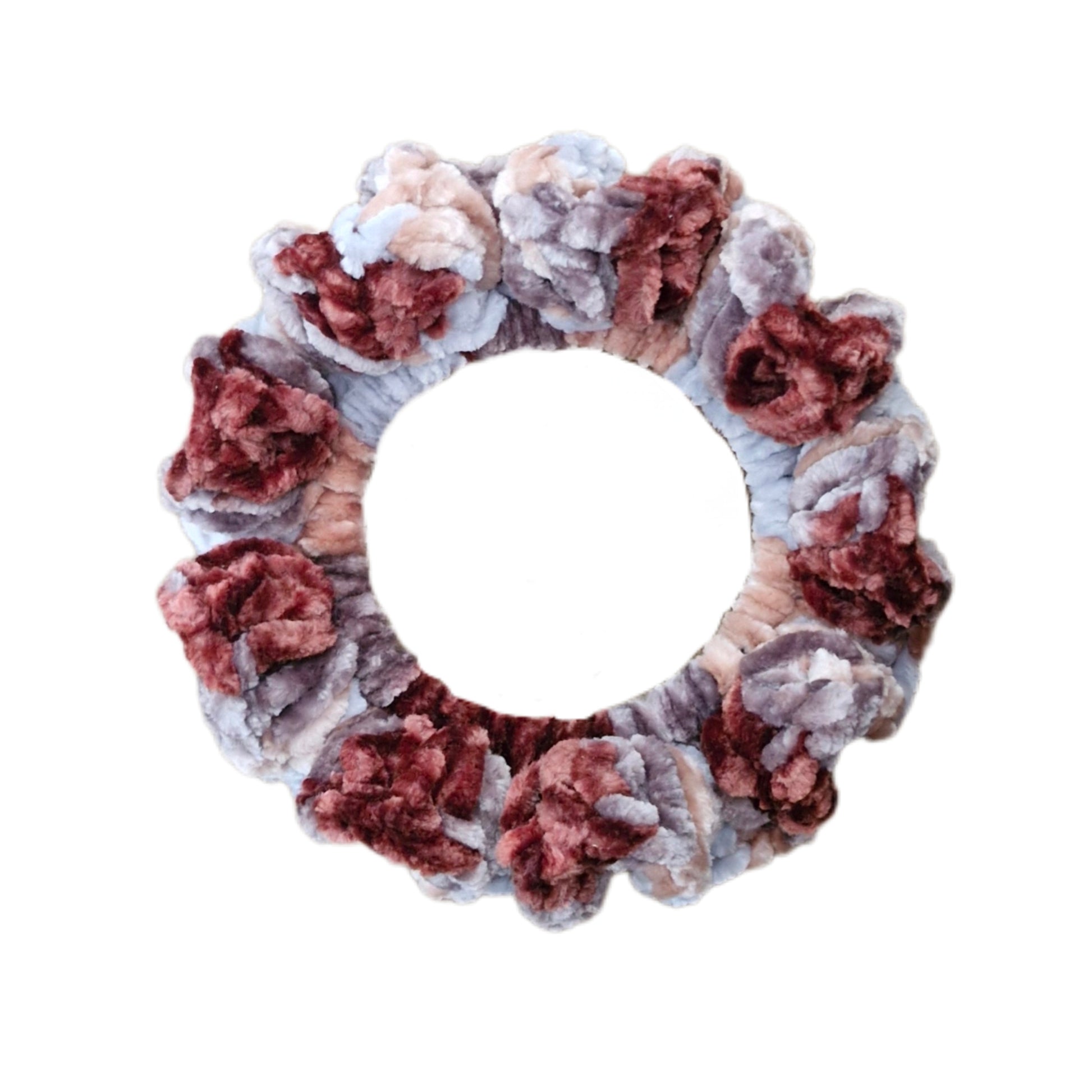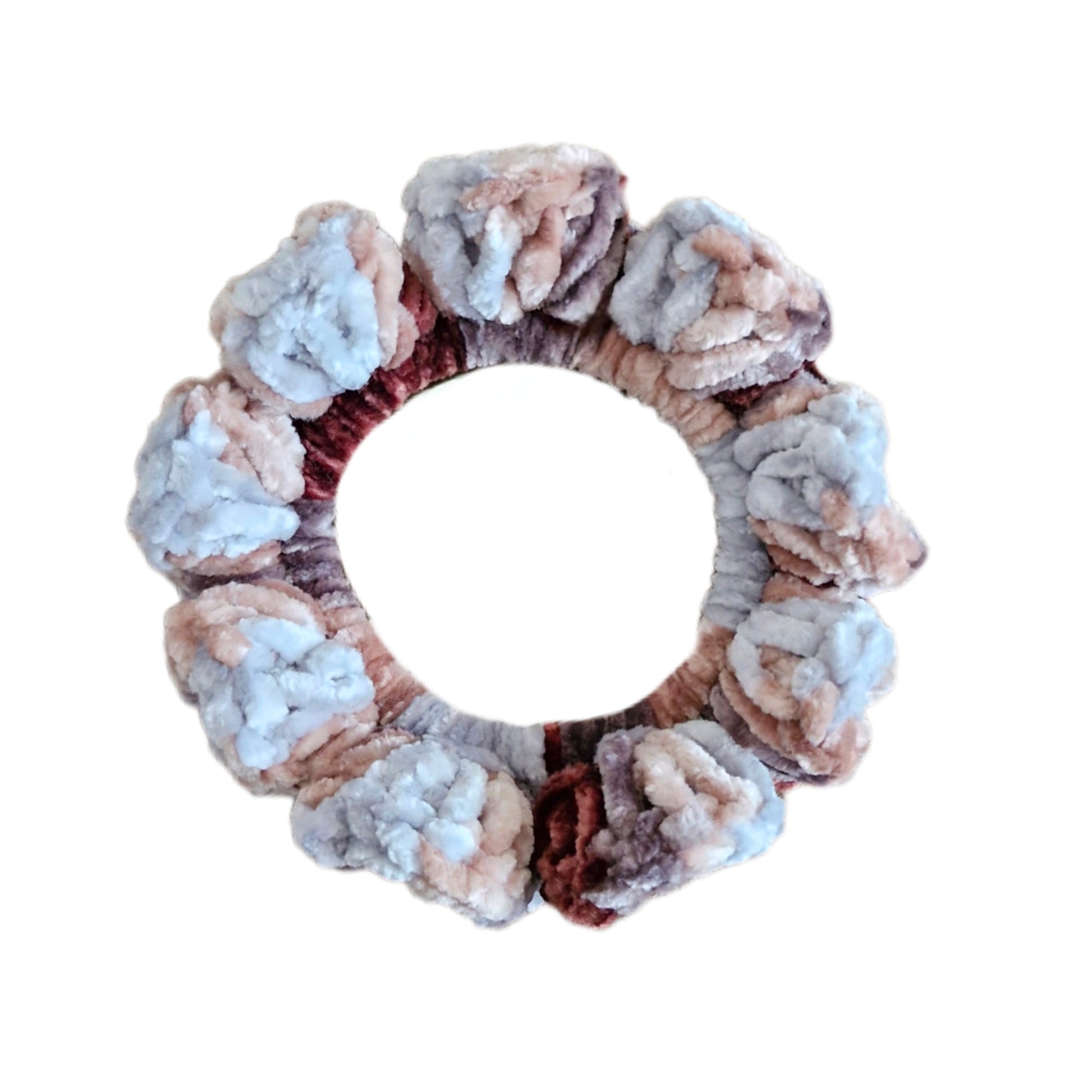 This velvet scrunchie is a blend of four earthy colours, mist grey, baby blue, honey brown and burgundy. It's the perfect addition for all autumn outfits, but it can be worn at any time of the year. Scrunchie will vary from the picture as it is a multi-colour yarn.