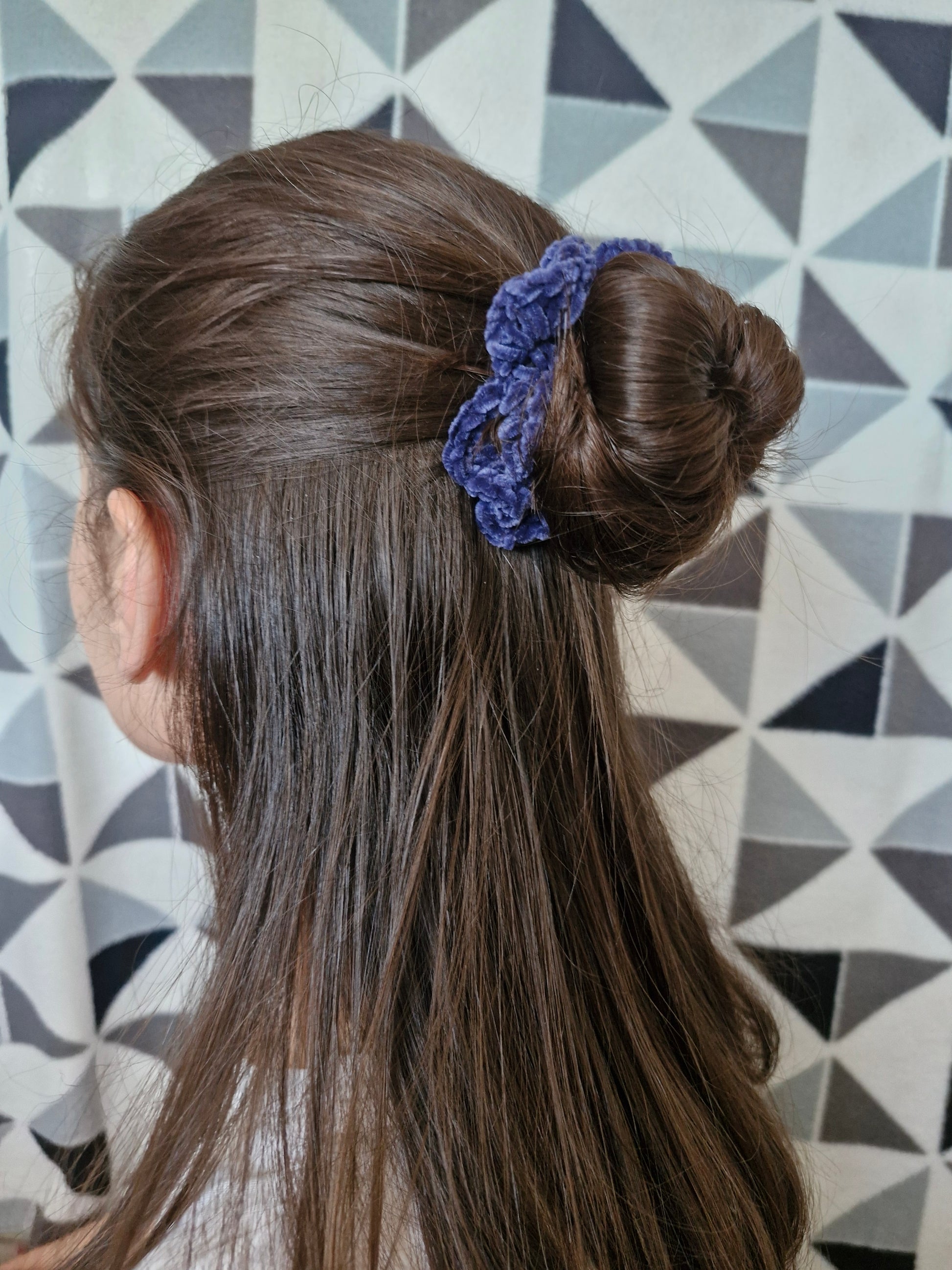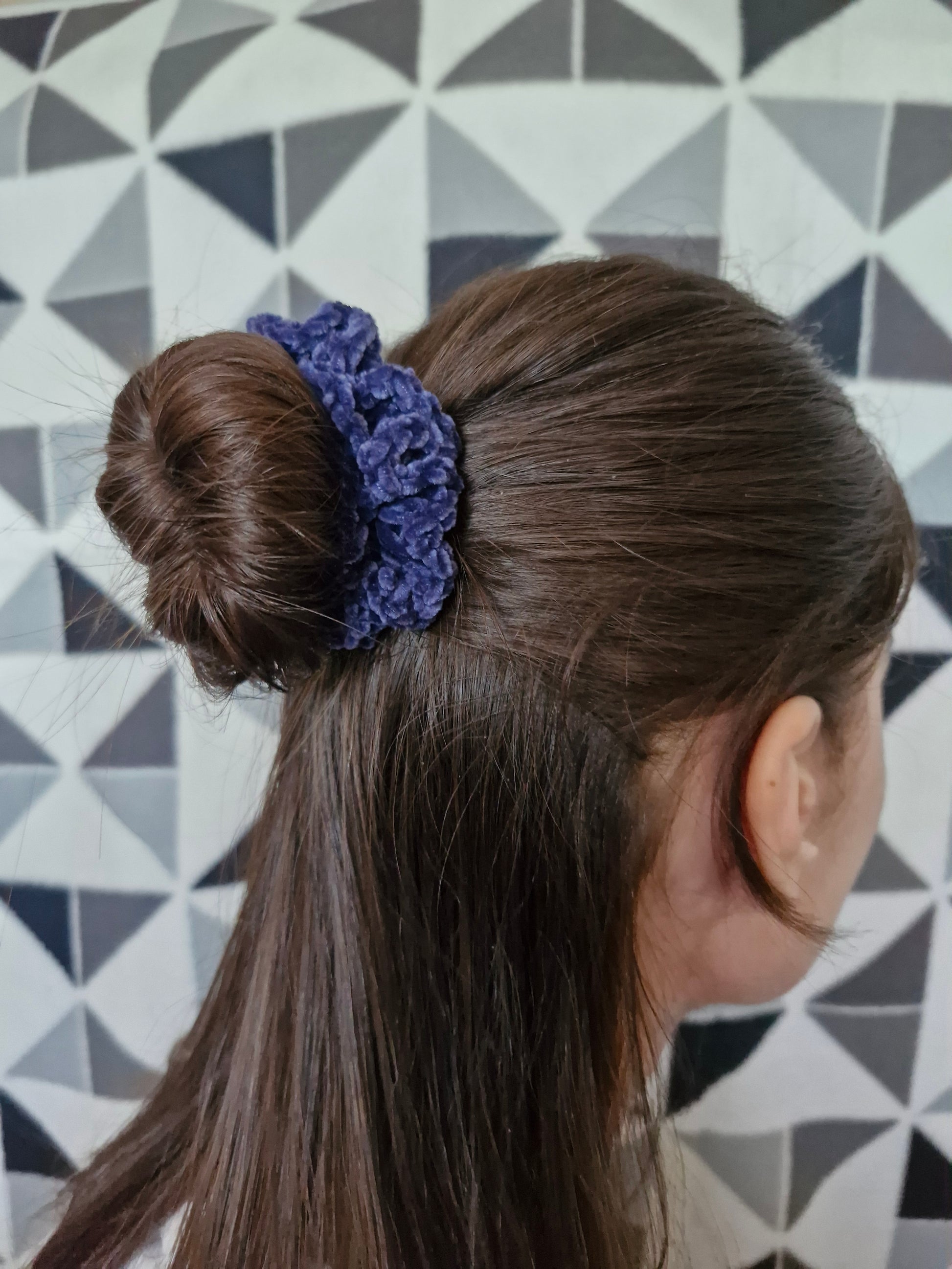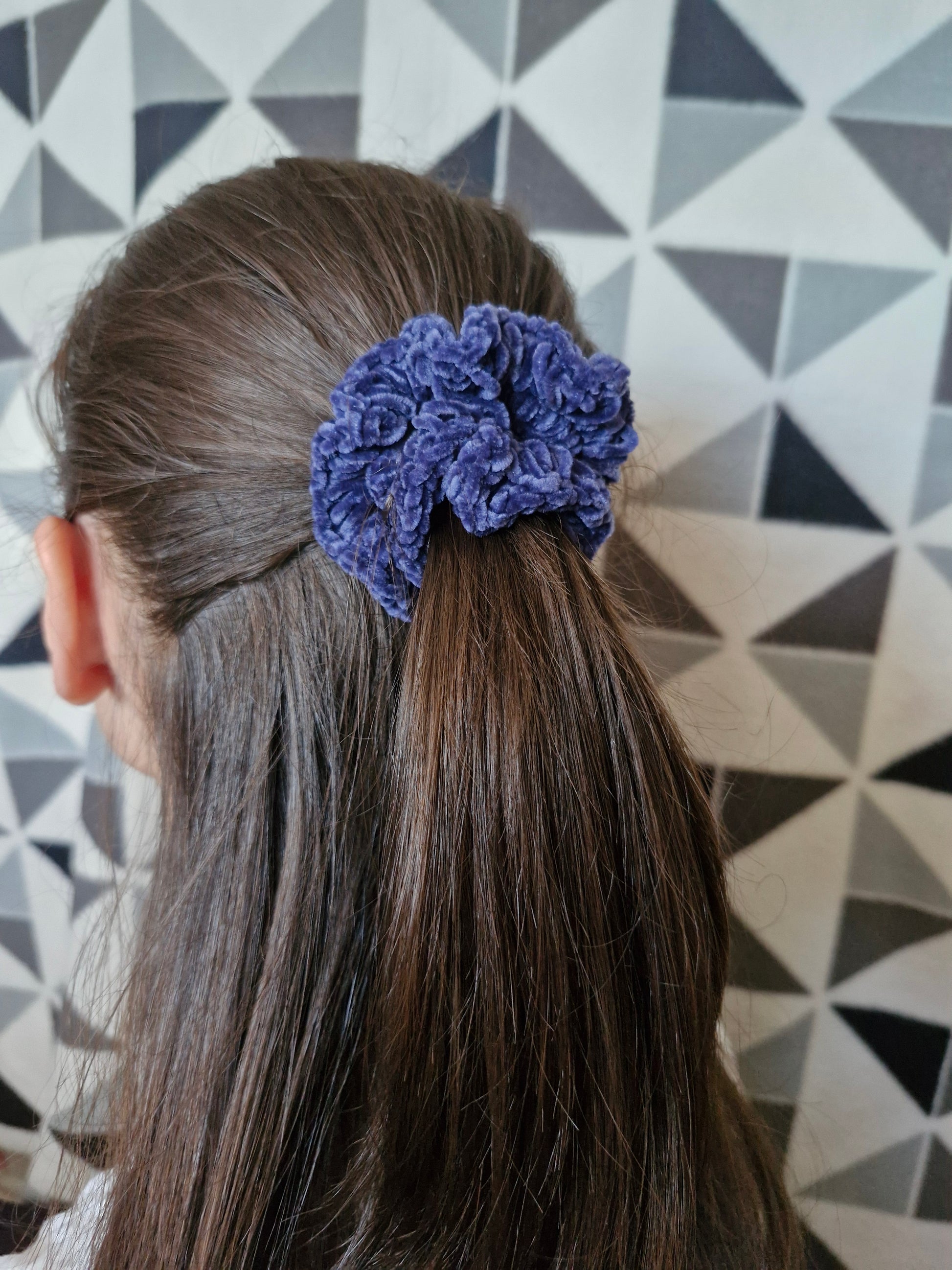 A dark rich blue, this scrunchie is an elegant addition to any outfit. Its velvet sheen resembles the sweet glow of a freshly washed blueberry. It is a treat to wear on your wrist and in your hair.