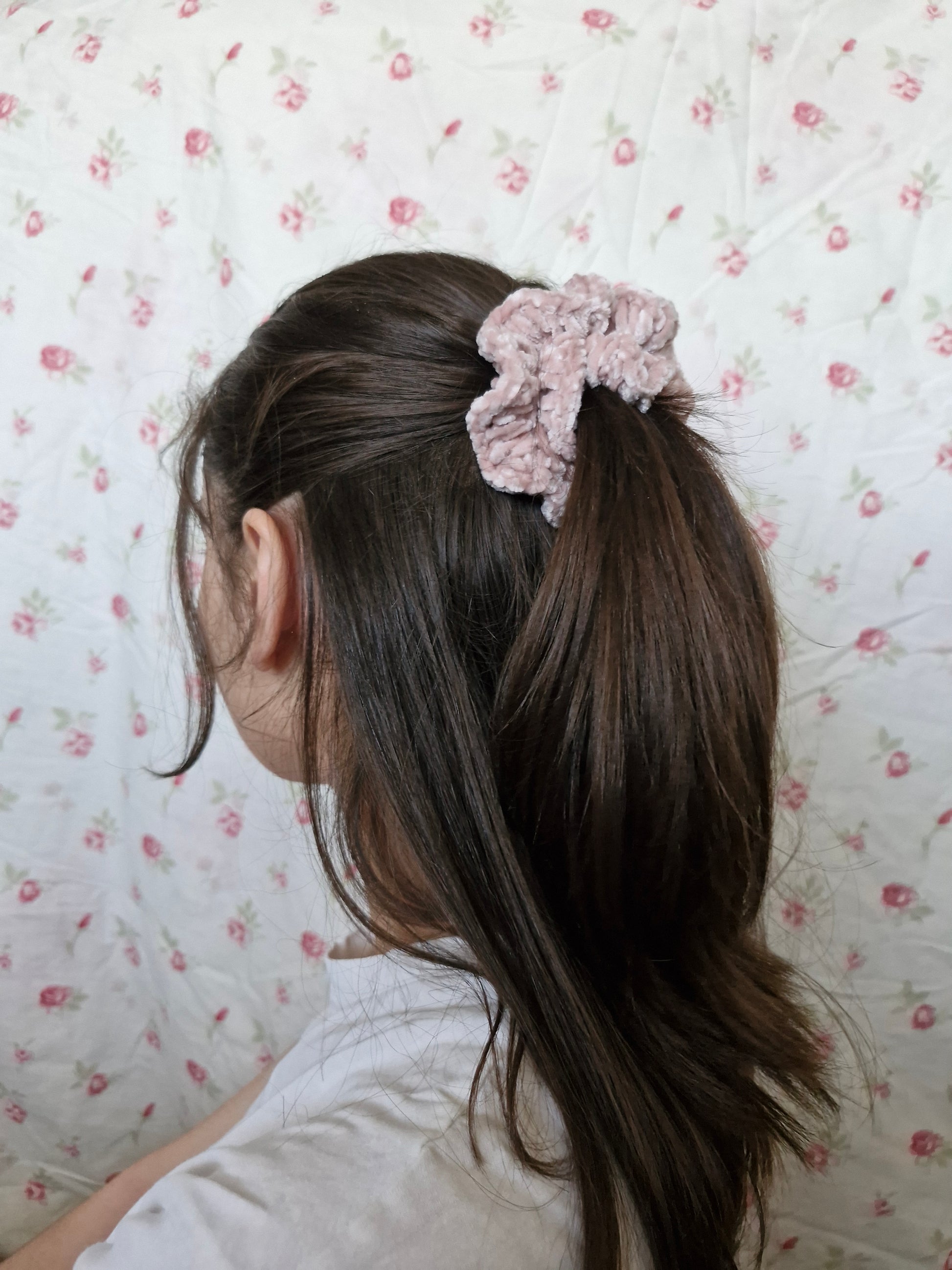 This blush pink scrunchie is both romantic and serene, making it a perfect accessory for a soft, feminine look.