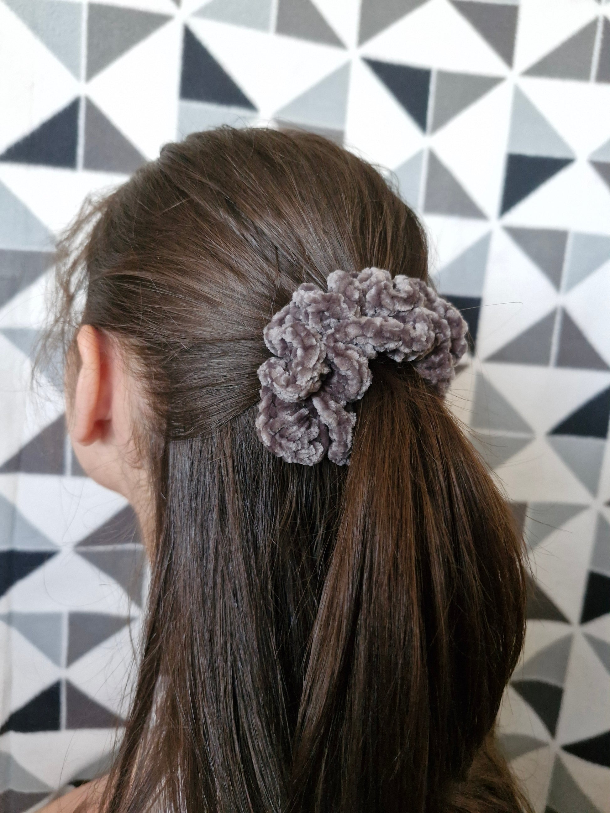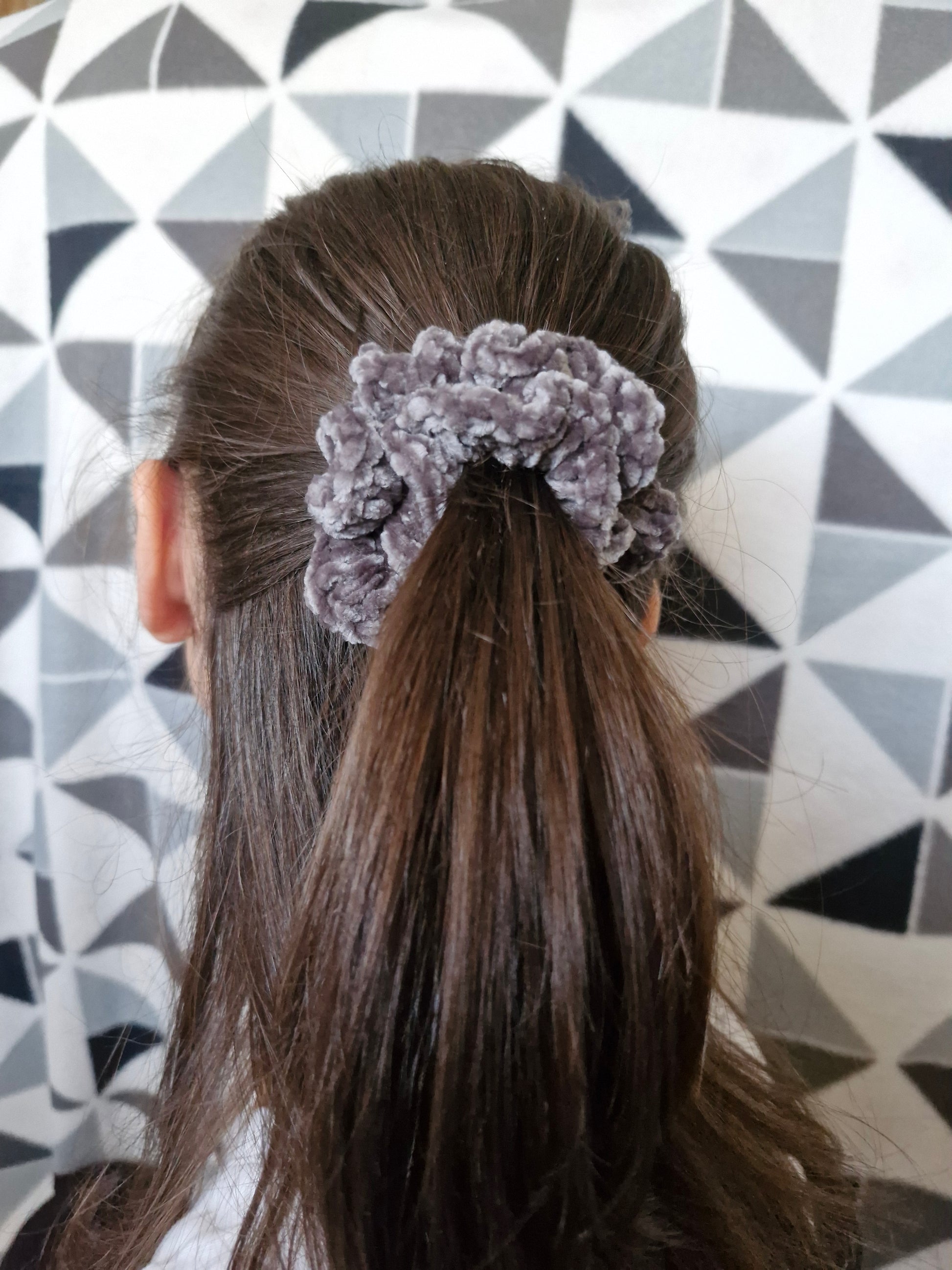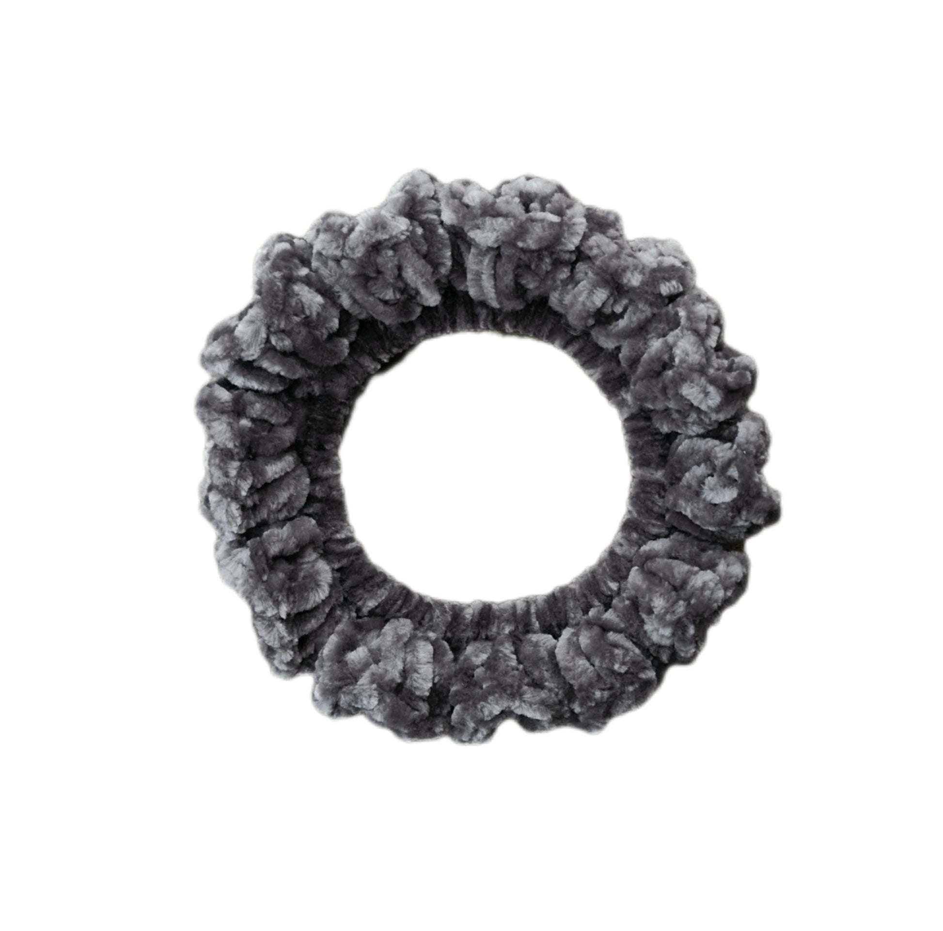 A deep grey scrunchie that radiates elegance and class. It is a chic addition to any outfit with its velvet glowy sheen. .