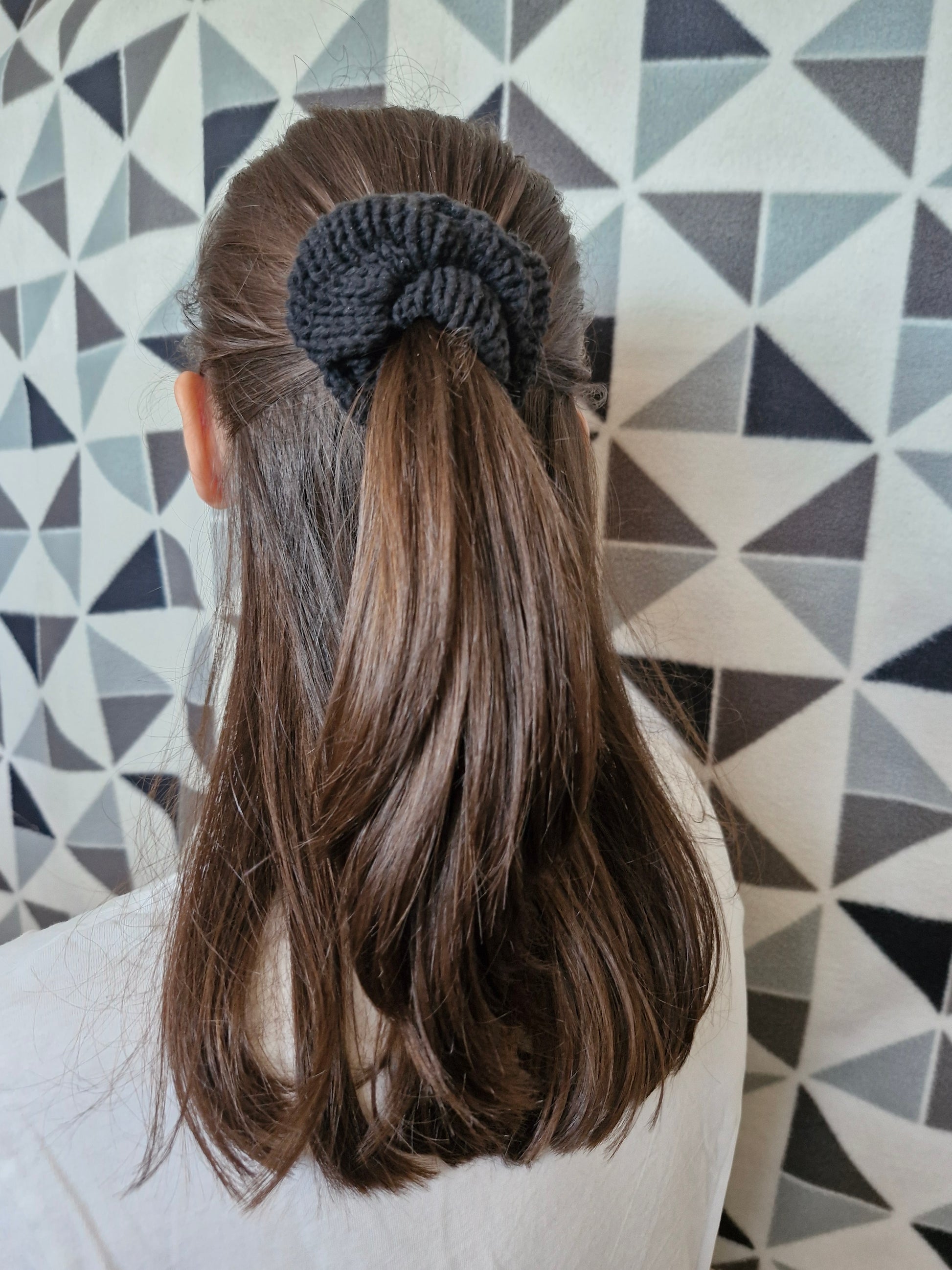 It’s a total eclipse with this buttery smooth black knitted scrunchie. Its matte finish allows it to blend and match perfectly with any outfit.