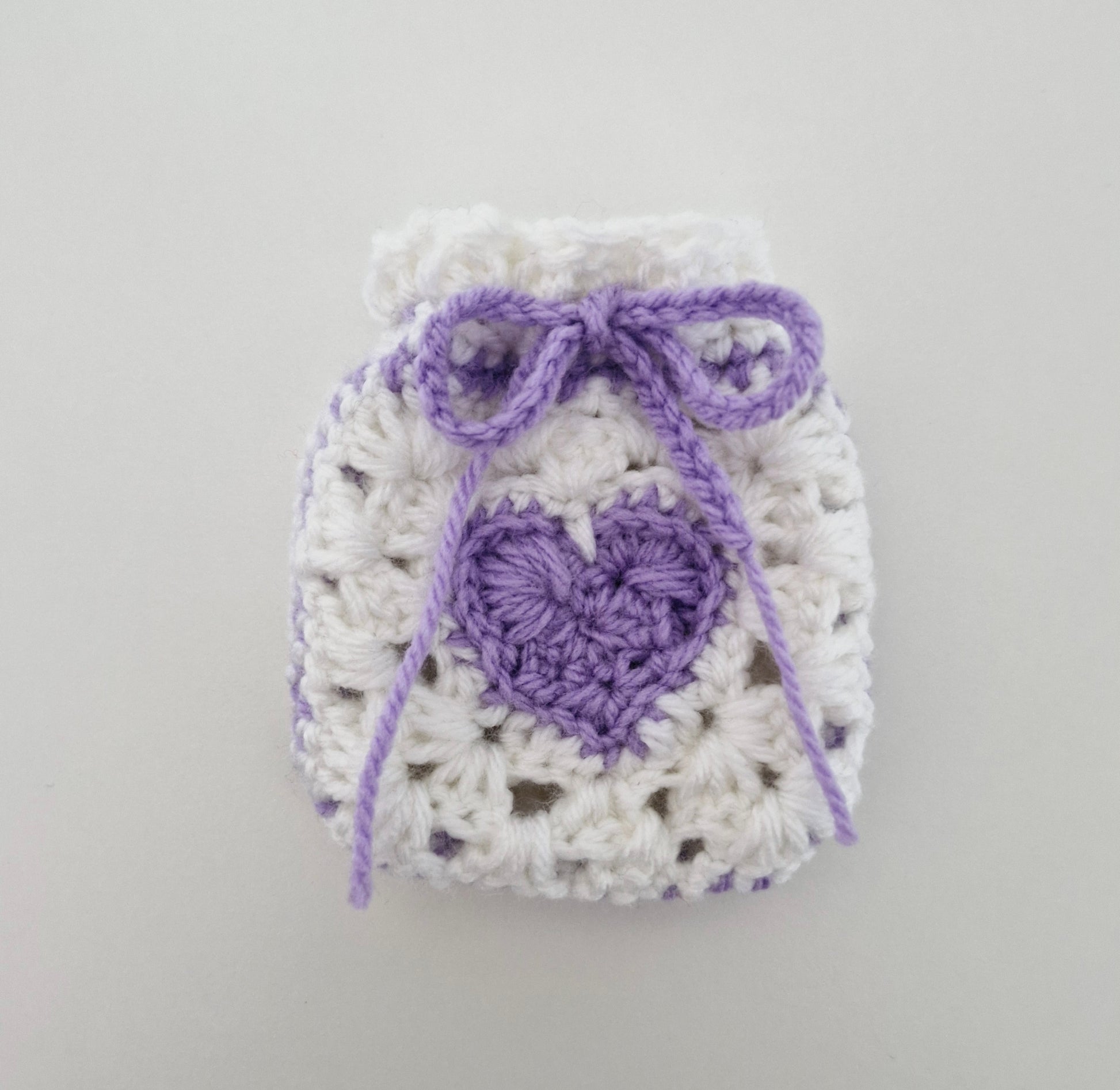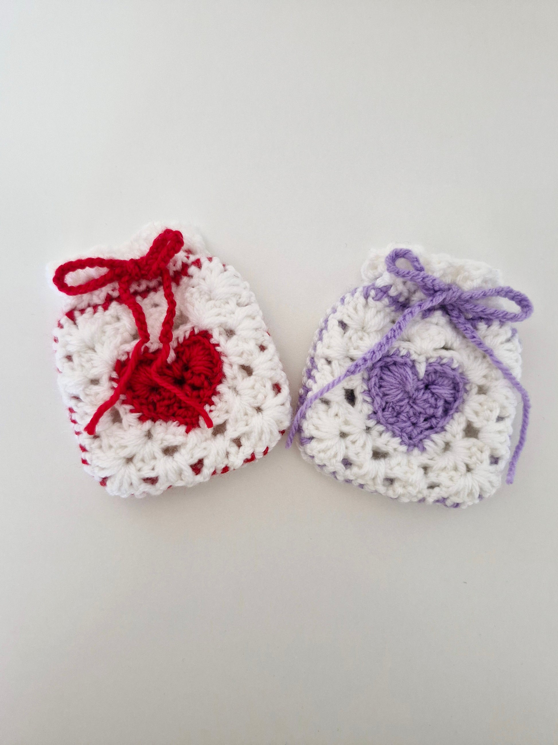 A mini crochet pouch with an adorable red or purple heart accent on the front and back, with a coloured string that you can pull tight into a bow to close. A perfect place to store your small items that go into your bag, from cards to cosmetics, or candy to car keys.. You can even use it as an air pod or earphone case.