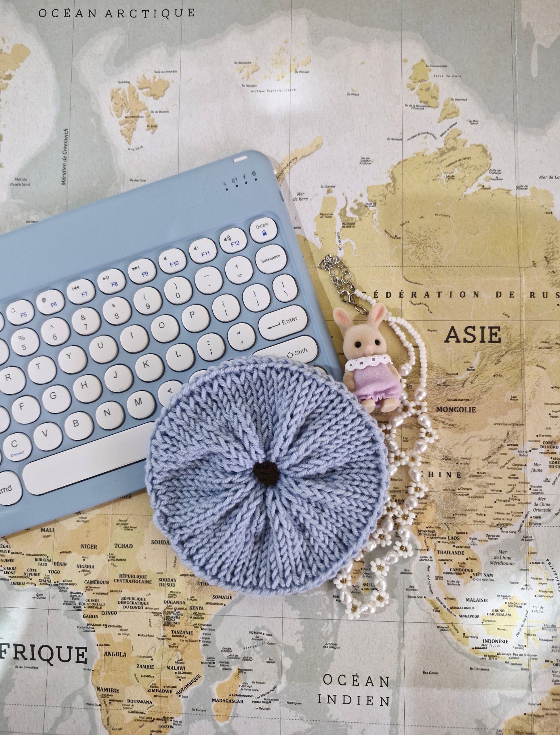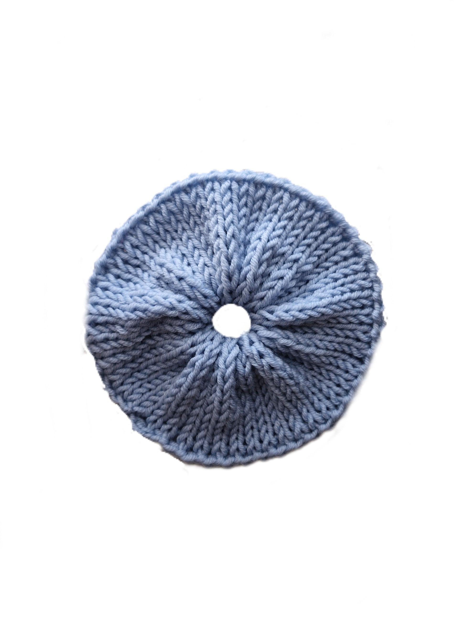 A beautiful sky blue knitted scrunchie made from 100% organic merino wool. Which is perfect for fine hair, super soft and gentle when removing.